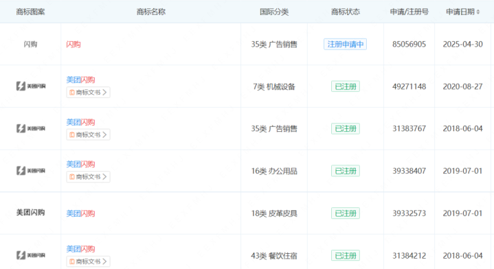 美团早在多年前就已成功注册多件“美团闪购”“美团闪购及图”商标,今年又补充注册“闪购”商标,目前处于申请中状态。