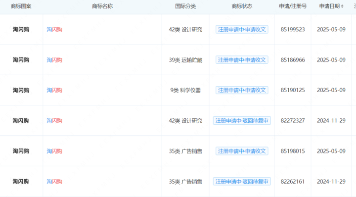 2025年以来,阿里巴巴(中国)有限公司已申请“淘闪购”“TAOBAOSHANGOU”“淘宝闪购 点外卖更优惠”等多枚闪购系列商标,涉及广告销售、网站服务等领域。